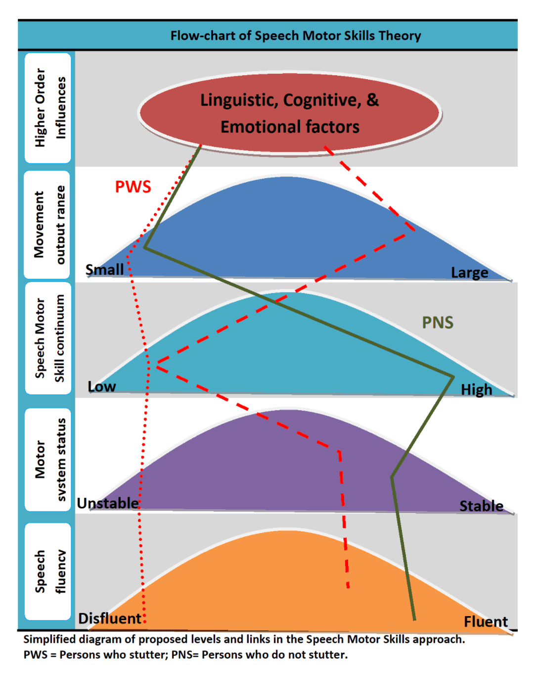 The strength of the SMS approach is its ability to explain and predict how and why interactions between language, cognitive, emotional, and sensorimotor systems can lead to certain observed behaviours in PWS (Van Lieshout et al., 2004). Although by no means a complete account of all stuttering phenomena, the SMS approach offers a theory-driven testable platform from which it is possible to provide insights as to why PWS might differ from PNS (rather than just how) in terms of their abilities to produce fluent speech (Peters et al., 2000).