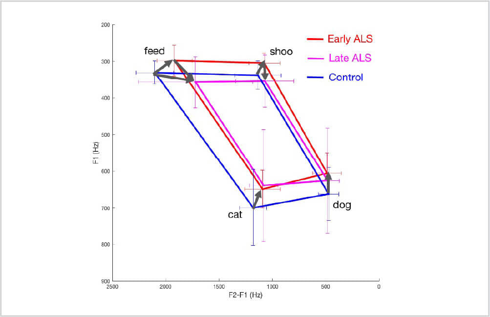 Figure 1. Changes in phonetic distinctiveness of vowels. Average vowel space with error bars (i.e., ±2 SEs for F1 and F2–F1 for each vowel) for healthy controls (blue) and individuals at the early (red), and late (magenta) stages of bulbar amyotrophic lateral sclerosis.